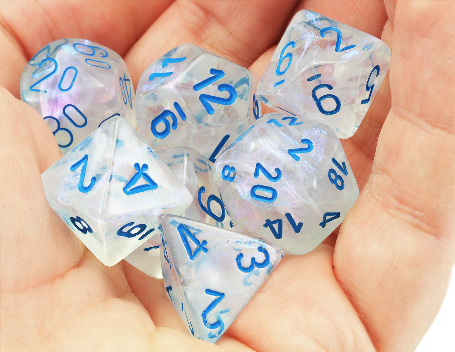 Borealis Luminary dice have all the classic polyhedral shapes you need: d4, d6, d8, d10, d00, d12, and d20. The dice are perfect for Dungeons & Dragons, Pathfinder, and all your favorite tabletop roleplaying games. Etched numbers are inked in light blue for easy reading after each roll-to-hit and saving throw.