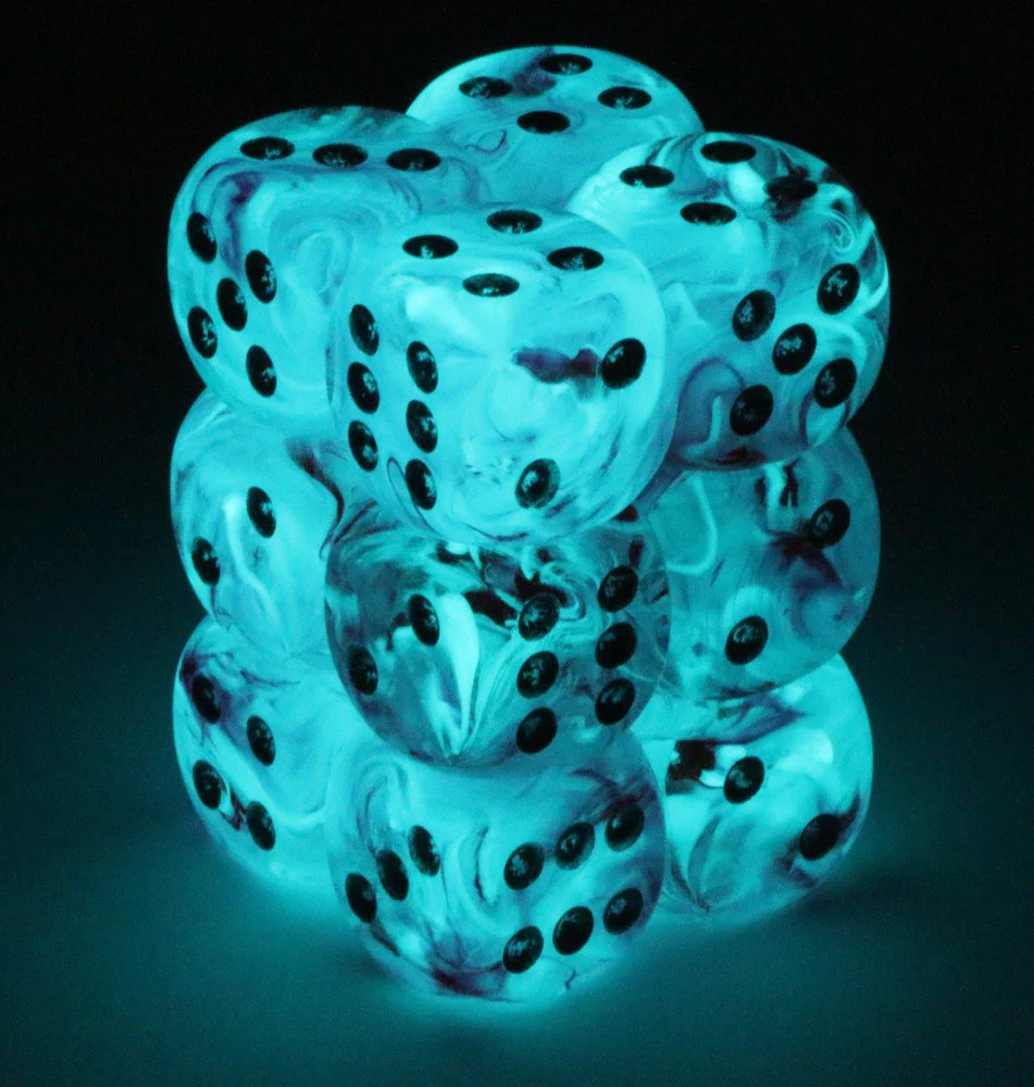 Ghostly Glow dice are a semi-translucent pink with ethereal wisps of color. After exposure to light, these dice glow an eerie blue color when the lights go out.