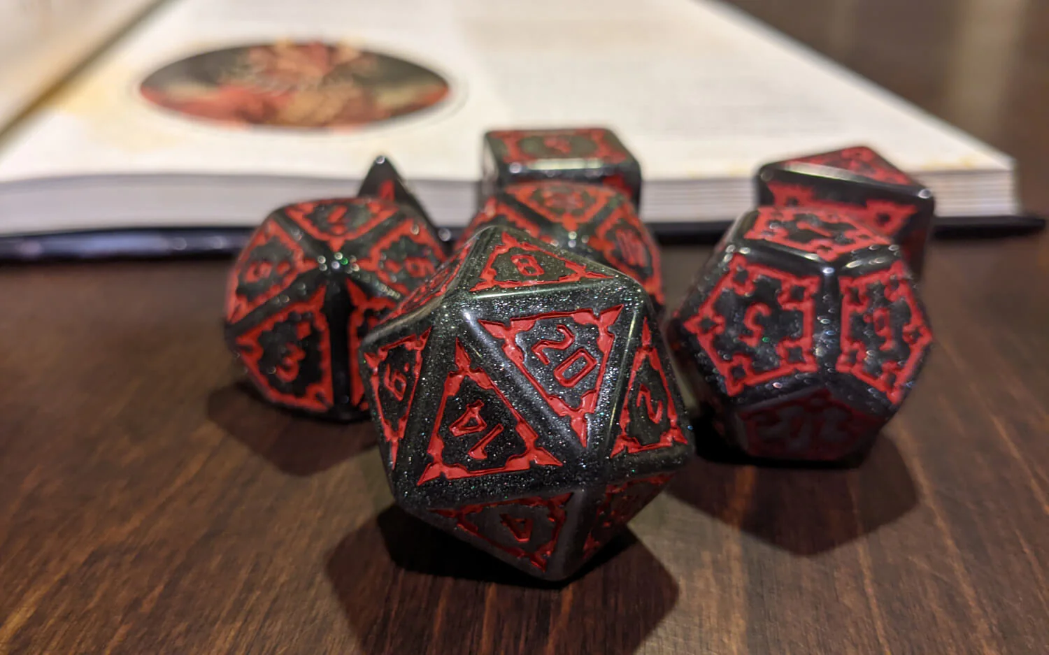 These dice are impressive. Each oversized die is crafted in a beautiful black color. The etched, easy-to-read numbers are are offset with knightly carvings and designs in red ink.